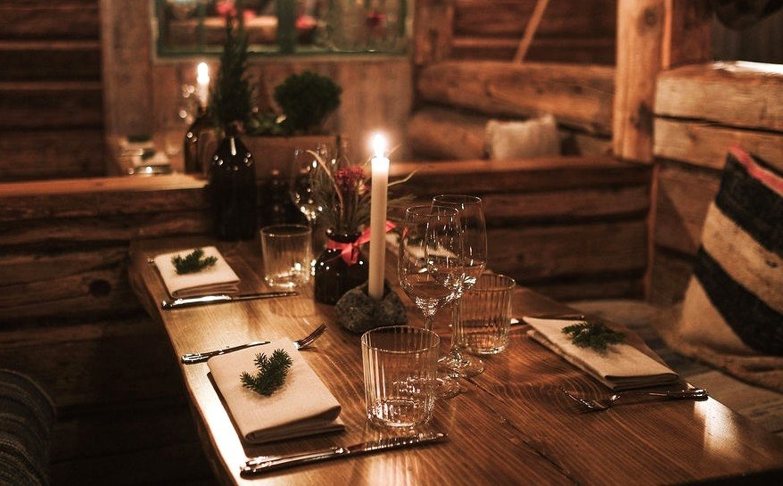 Kvällen börjar med egentillverkad glögg i vår Tentipi, därefter in till det uppdukade julbordet med de hemmabrända snapsarna och ett urval av det godaste goda och det finaste fina, allt det som vi tycker ska finnas på ett traditionellt julbord i Jämtland.